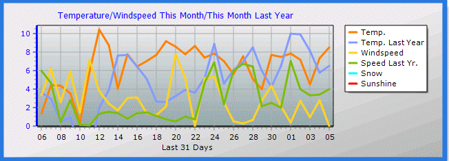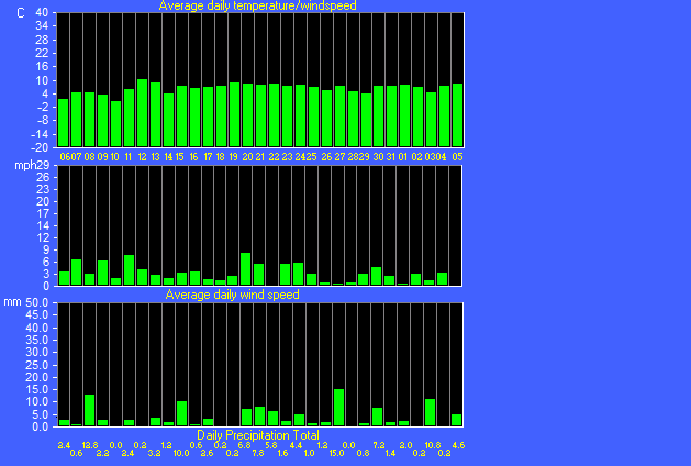 Maximum windspeed = 9.2 mph from 076°(ENE) on day 05 at time 06:23